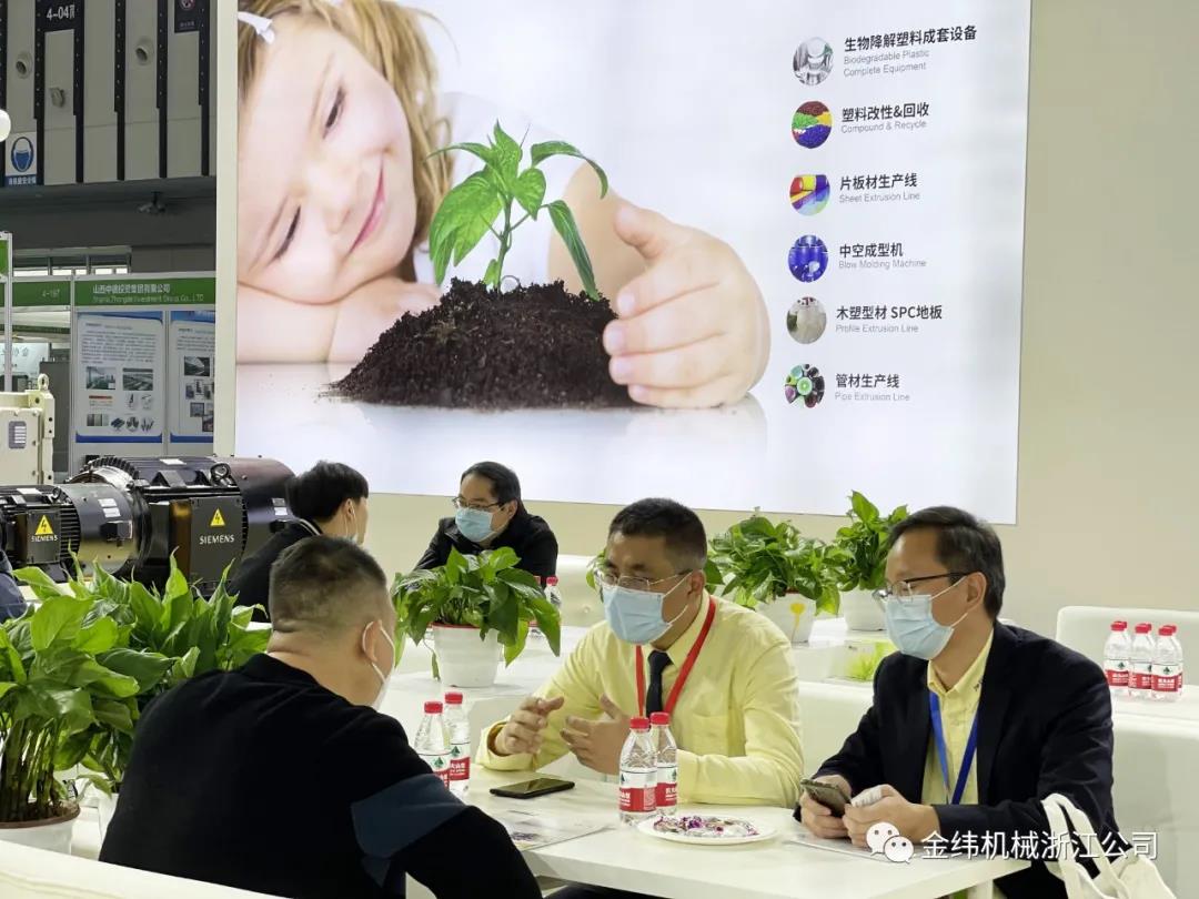 这次我司现场展出可降解专用改性设备超高扭矩平双主机、PLA可降解三辊压光机、四机共挤机组及中空成型机等系列的多款产品,每一款产品都拥有特定的应用领域,并且各自有着优异的各项性能和稳定的品质。金纬机械以强大的服务团队现场讲解、分享可降解塑料的各种应用,引领塑料机械行业新材料、新技术、新装备。